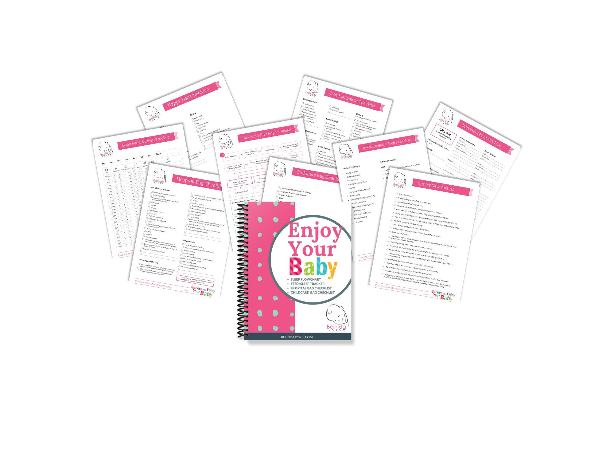 Checklists: Equipment, hospital bag, nappy bag, travel bag & childcare bag Newborn Sleep Flowchart- gentle approach Baby Feed & Sleep Tracker -find your rhythm